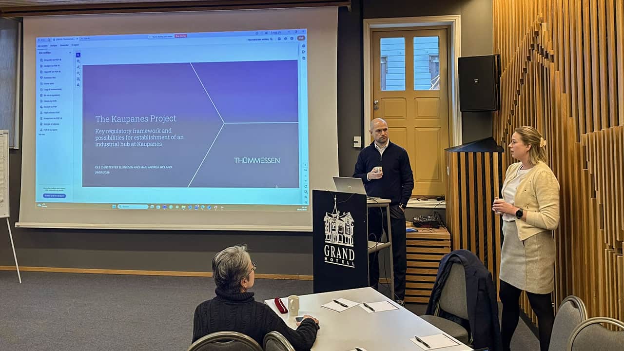 Konferanserom med deltakere og en person som presenterer noe på et stort lerret
